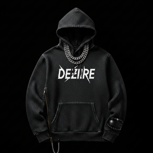 Branding: Distressed “DEZIRE” lightning-font graphic across the chest for a high-impact look.